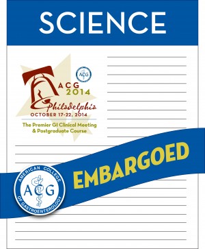 All research presented at the ACG Annual Scientific Meeting is strictly embargoed until 8:00 a.m. on the first day of the Annual Meeting. For 2014, this is Monday, October 20 at 8:00 a.m. EDT.