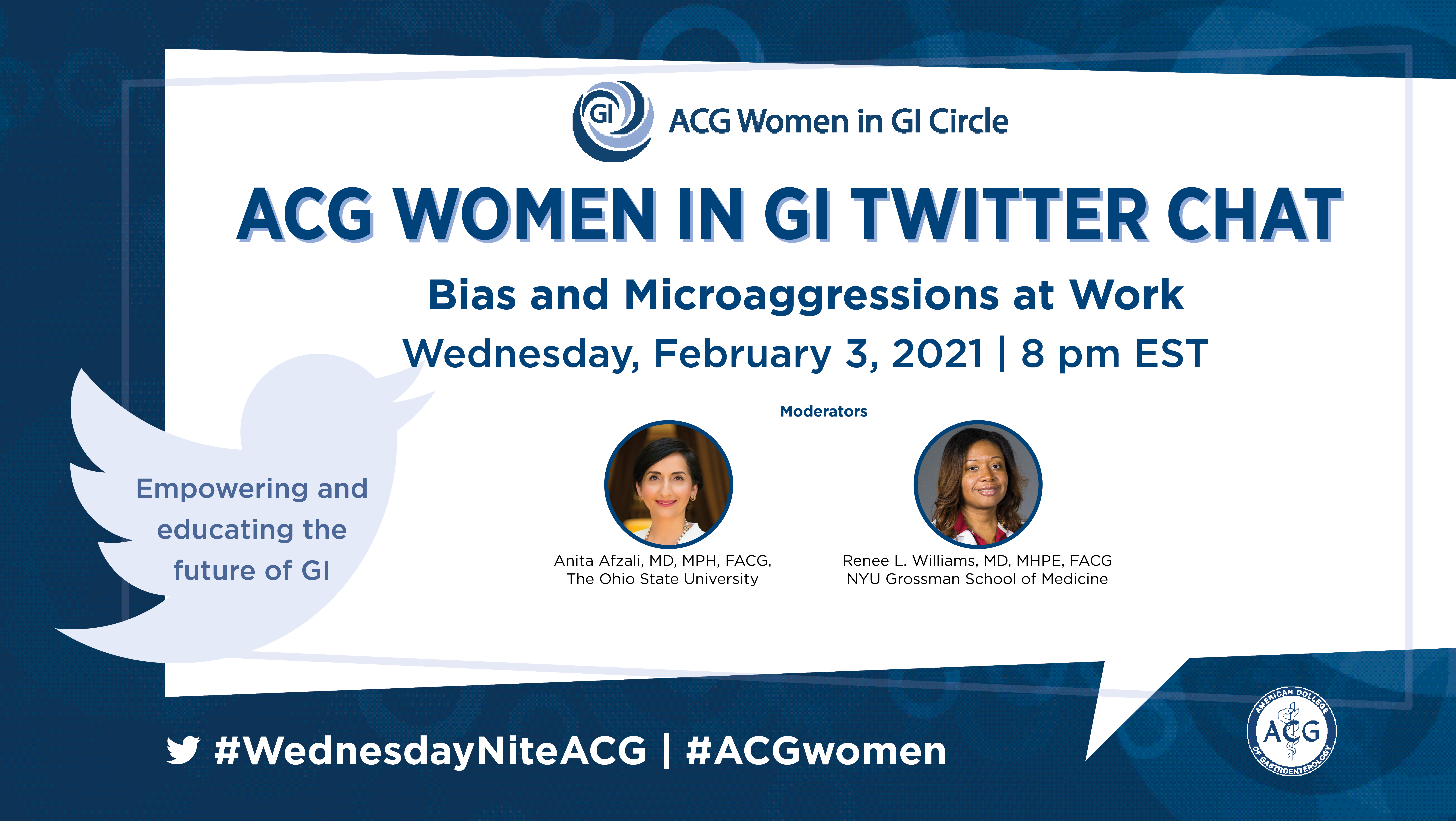 Tag your nominee in a tweet and share why they inspire you, using the hashtags #NWPD and #ACGwomen, and include @AmCollegeGastro so we can share it with the GI community! Other suggested hashtags are #IAmBlackwell, #HeforShe, and #SheLeadsGI.