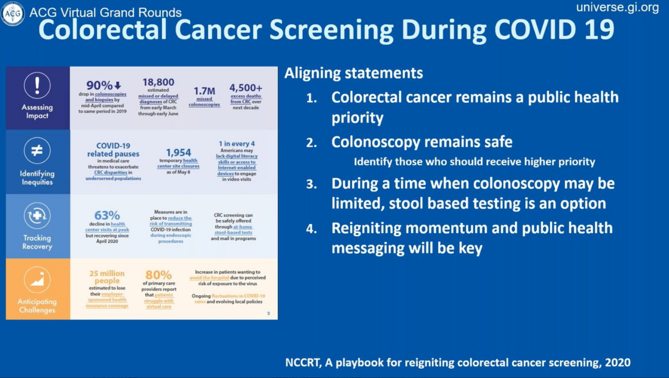 At the ACG Virtual Grand Rounds, ACG President Dr. Greenwald identified the current strategies for colorectal cancer screening and prevention in the United States and globally, and discussed the impact of the COVID-19 pandemic on colorectal cancer screening efforts and likely outcomes.