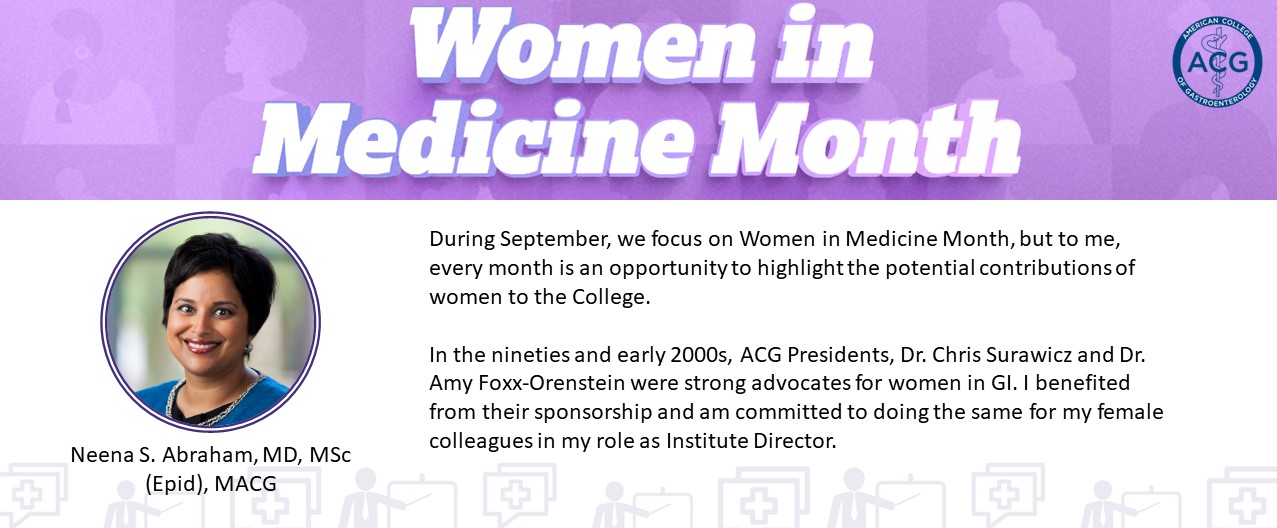 September is Women in Medicine Month! Please join me in celebrating the accomplishments of ACG’s women in gastroenterology. The rising number of women in medicine are working towards advancing equity, ensuring inclusion, and driving the future change needed in gastroenterology and hepatology. Women in gastroenterology have felt empowered to challenge the status quo. It is exciting to see the positive forward momentum, and I am honored to be a part of it.