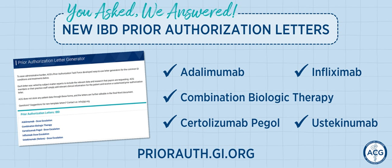 ACG’s Prior Authorization Letter Generator is a go-to resource for reducing administrative burdens in your practice. Our easy-to-use tool helps you create custom letters and does not store any patient data. In 2024, we added five new peer-reviewed letters for IBD treatments with the data payors are requesting. Create your custom letters now >