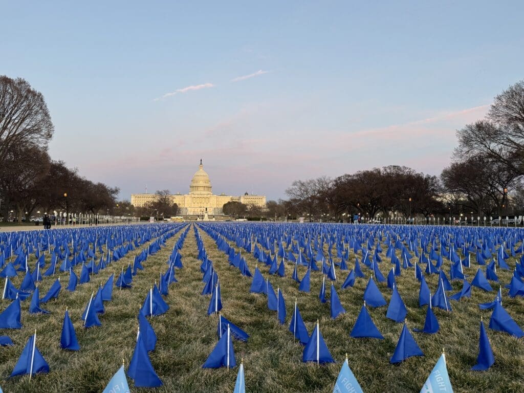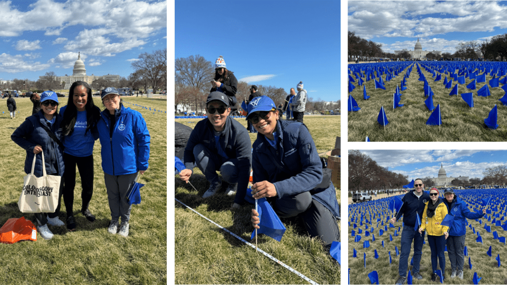 On Sunday, March 9, 2025, ACG PR Committee Chair Dr. Reezwana Chowdhury, ACG members, and College staff volunteered to help advocates from Fight Colorectal Cancer install the flags on the National Mall for their “United in Blue” display. A dramatic installation of 27,400 blue flags on the National Mall near the U.S. Capitol is a powerful visual representation of those younger than 50 who will be diagnosed with colorectal cancer in 2030 unless we do more to educate, screen, and raise awareness.