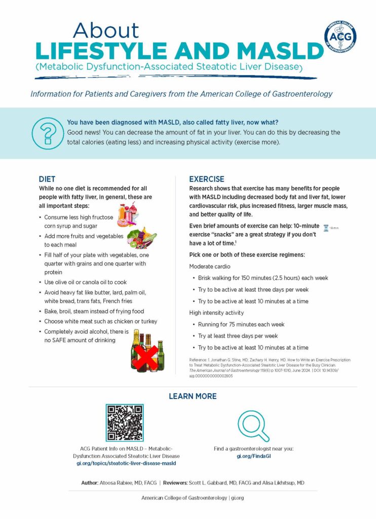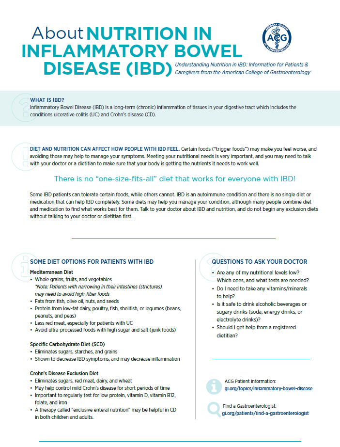 The College’s commitment to nutrition and digestive health includes developing clinical guidelines for physicians, providing the most up-to-date recommendations to guide physicians in treating digestive diseases and conditions. ACG also develops one-page health information handouts for patients using simple language.