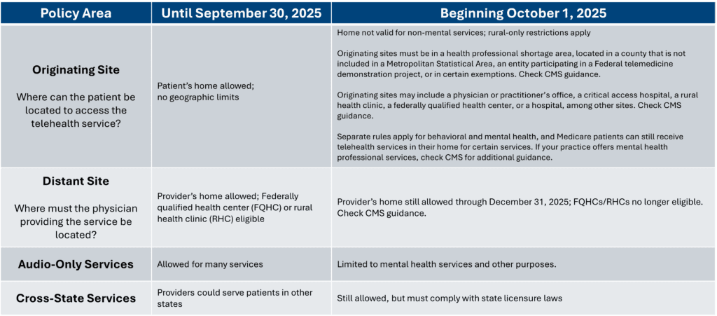 The end of the COVID-era telehealth flexibilities primarily affects your patients on traditional, fee-for-service Medicare. For your patients on Medicare Advantage plans, telehealth coverage may differ on a payor-to-payor basis.