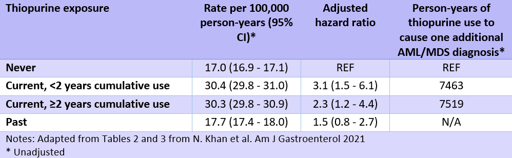 This article reviews Khan N, Patel D, Trivedi C, et al. Incidence of Acute Myeloid Leukemia and Myelodysplastic Syndrome in Patients with Inflammatory Bowel Disease and the Impact of Thiopurines on Their Risk. Am J Gastroenterol 2021; 116: 741-47. www.doi.org/10.14309/ajg.0000000000001058