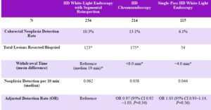 Among 563 patients, colorectal neoplasia was detected in 10.3% with HD white-light endoscopy with segmental reinspection (with 81% of lesions detected during first inspection), 13.1% with HD chromoendoscopy, and 6.1% in single-pass HD white-light endoscopy.