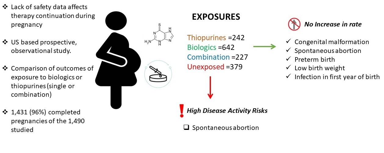 In this prospective cohort study of 1,712 pregnant women with IBD, thiopurine and biologic use were not associated with an increased risk of congenital malformations, SABs, preterm birth, low birth weight, or infant infections within 1 year, but increased IBD activity was associated with an increased risk of SAB (hazard ratio= 3.41; 95% confidence interval: 1.51-7.69). Also, these drug exposures were not associated with any differences in developmental milestones in the first year of life.