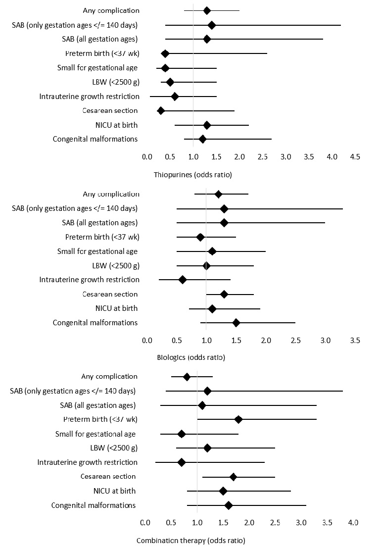 Figure 1. Adjusted odds ratios for the association of inflammatory bowel disease (IBD) therapies with adverse pregnancy-related outcomes (controlling for maternal age, steroid use, and IBD activity). LBW, low birth weight; NICU, neonatal intensive care unit; SAB, spontaneous abortion.