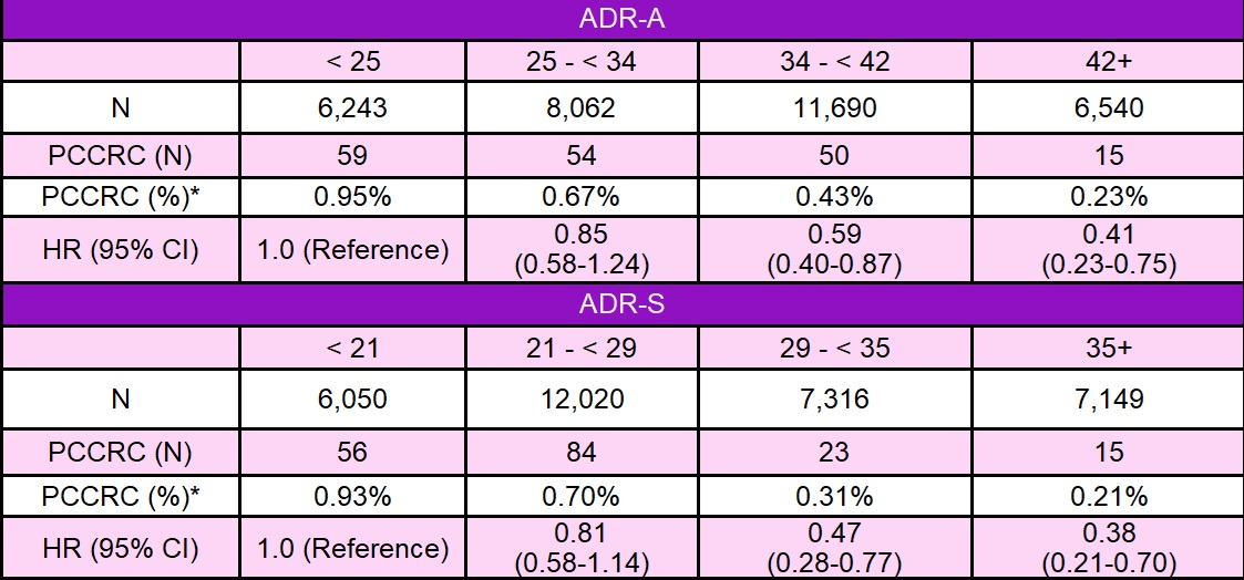 Results: In 32,535 patients, a lower hazard for PCCRC (n=178) was observed for ADR-A’s > 23%, as compared to ADR-A’s <23% (Reference) (23%-<29%: hazard ratio [HR] 0.56, 95% confidence interval [CI]: 0.36-0.87; 29%- <34%: HR 0.60, 95% CI: 0.38-0.94; 34%-<44%: HR 0.43, 95% CI: 0.29-0.65; and ≥44%: HR 0.32, 95% CI: 0.16-0.63) [Table 1]. The highest quartile of ADR-A (42%+) (HR=0.41 95% CI:0.23-0.75) had a similar protection from PCCRC as the highest quartile of ADR-S (35%+) (HR=0.38 95% CI:0.21-0.70) [Table 2]. We also observed 95% CIs for ADR’s were 28% narrower (median=0.72; IQR:0.10) for endoscopists when using ADR-A versus ADR-S.
