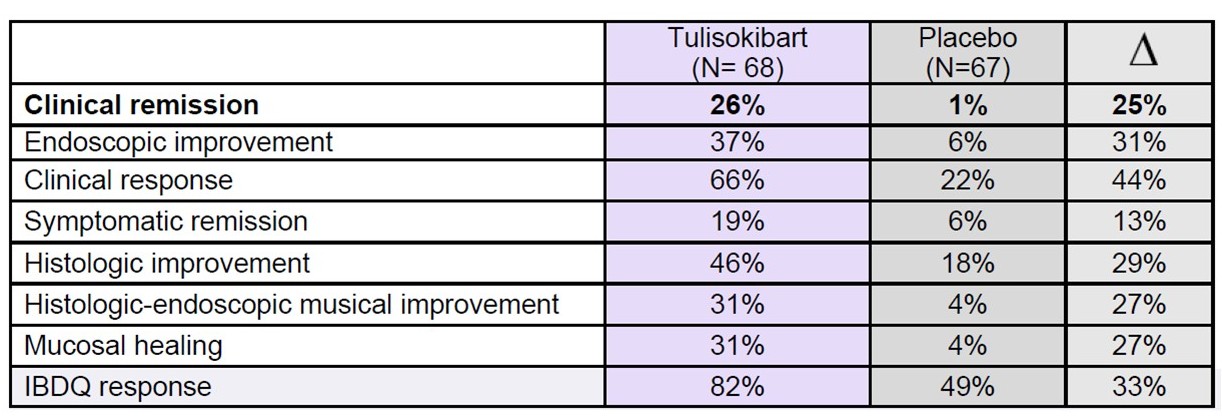 In cohort 1, 135 patients were randomized. A significantly higher proportion of patients who received tulisokibart achieved clinical remission compared to those who received placebo (26% vs 1%; 95% CI, 14 to 37; P <0.001). Tulisokibart also demonstrated significant benefits over placebo across all ranked secondary endpoints.