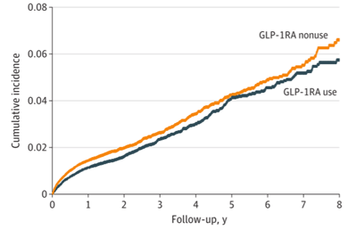 Figure 1. Cumulative incidence of overall cancer in patients receiving GLP-1RAs compared with patients not receiving GLP-1RAs.