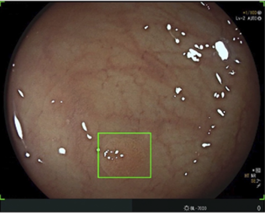 Interventions: Six experienced endoscopists (>2,000 colonoscopies completed) performed the colonoscopies, and were not blinded to study assignment. GI-Genius™ is a deep learning system that draws endoscopist attention to a potential polyp, by overlaying a “detection box” onto the endoscopy monitor (Figure 1). The endoscopist can then closely examine and resect the lesion as appropriate.