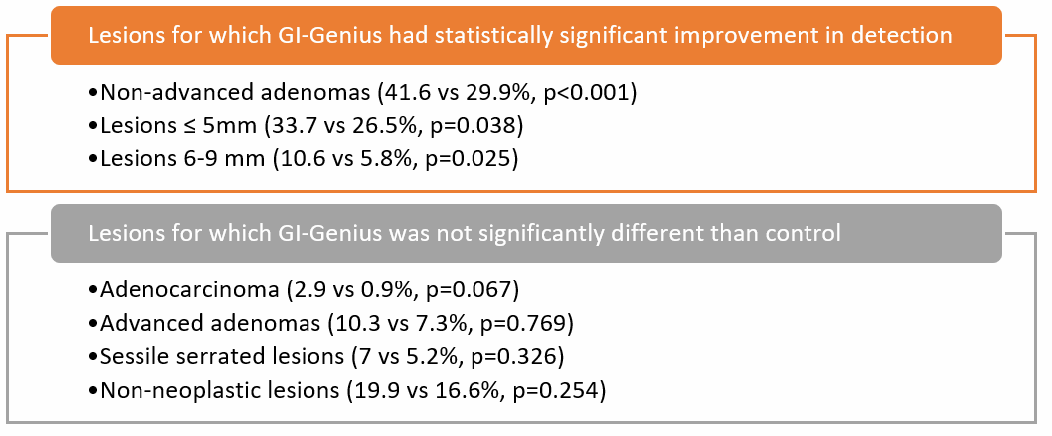 Results: A total of 685 patients underwent randomization, 341 in the GIGenius™ arm and 344 in the control arm. After adjusting for age, gender, and indication, ADR was significantly higher in the GI-Genius™ group, RR, 1.30; 95% CI, 1.14–1.45 (Table 1). This reflects increases in detection of non-advanced adenomas, including lesions < 5mm and 6-9 mm lesions. The GI-Genius was adept in detecting lesions that were polypoid and nonpolypoid, both in the proximal and distal colon. The GI-Genius™ did not detect significantly more advanced adenomas, adenocarcinomas, or sessile serrated lesions, as compared to controls. The authors also evaluated those “polyps” that were resected without any histologic pathology. There was no statistically significant difference in this non-neoplastic resection rate between the 2 groups.