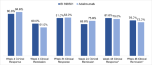 Results: 147 patients were enrolled and received either BI 695501 (n=72) or adalimumab (n=75). At week 4, 61/68 (90%) and 68/72 (94%) had clinical response with BI 695501 and adalimumab, respectively (RR 0.95, 95% CI 0.87-1.03). At week 24, 55/68 (81%) and 59/72 (82%) achieved clinical response and 46/68 (68%) and 54/72 (75%) achieved clinical remission for BI 695501 and adalimumab, respectively. At week 48 (after patients in the adalimumab group switched to BI 695501 at week 24), 55/68 (81%) and 57/72 (79%) achieved clinical response and 52/68 (76%) and 52/72 (72%) achieved clinical remission in the BI 695501 and adalimumab (now switched to BI 695501) groups, respectively (Figure 1). Drug-related adverse events were similar between treatment groups: 15/72 (21%) for BI 695501 and 17/75 (23%) for adalimumab during weeks 0-24 and 10/72 (14%) for BI 695501 and 11/75 (15%) for adalimumab during weeks 24-56. The most common drug-related adverse events for BI 695501 included weight gain (4% for BI 695501), injection site erythema (3% for adalimumab), and upper respiratory tract infection (3% for adalimumab). No adverse events led to death.