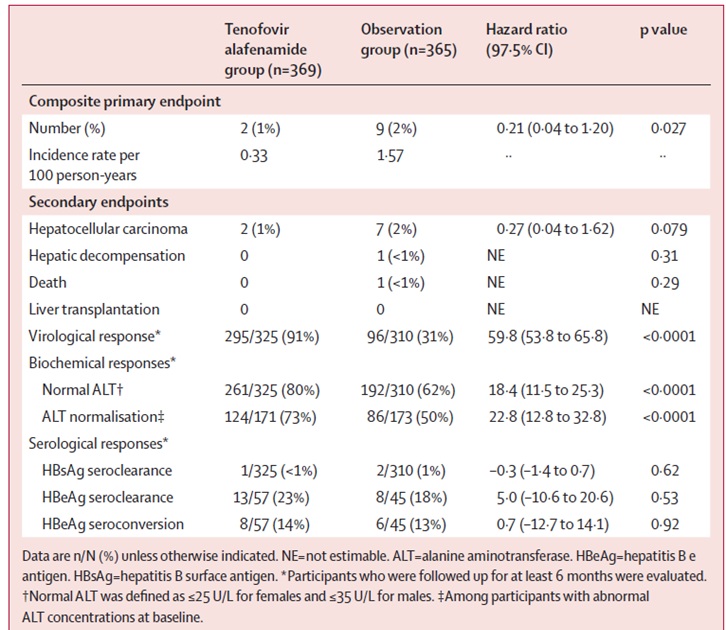 Results: Overall, 798 individuals were screened and 734 were randomized (369 to the tenofovir alafenamide group and 365 to the observation group), with baseline characteristics well balanced between groups. The composite primary endpoint—comprising HCC, hepatic decompensation, liver transplantation, or death—occurred in 2 (1%) participants in the tenofovir alafenamide group (0.33 per 100 person-years) compared to 9 (2%) in the observation group (1.57 per 100 person-years), yielding a hazard ratio of 0.21 (97.5% CI 0.04–1.20; P=0.027). (Table 1) Notably, among participants with normal ALT concentrations at baseline, no primary endpoint events were observed in the tenofovir alafenamide group versus 4 events in the observation group, with similar trends evident when applying European and Asia-Pacific ALT criteria.