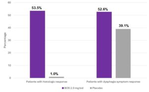 Key secondary efficacy endpoints, such as deep histologic response (≤1 eos/hpf), histologic response (≤15 eos/hpf), reduction in EREFS score, and maximum peak eosinophil count, also favored BOS over placebo. Additionally, BOS-treated patients showed greater reductions EoEHSS scores compared to placebo.
