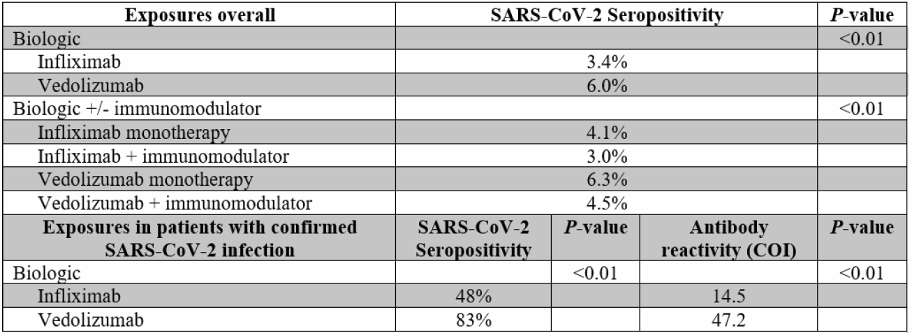 The authors found that the seroprevalence of anti-SARS-CoV-2 antibodies was lower among IBD patients treated with infliximab compared to vedolizumab. Among patients with COVID-19 infection confirmed by PCR testing, there were lower rates of antibody responses and a lower magnitude of antibody reactivity among those treated with infliximab compared to vedolizumab. On multivariable analysis, infliximab and immunomodulator use were independently associated with lower anti-SARS-CoV-2 antibody seropositivity.