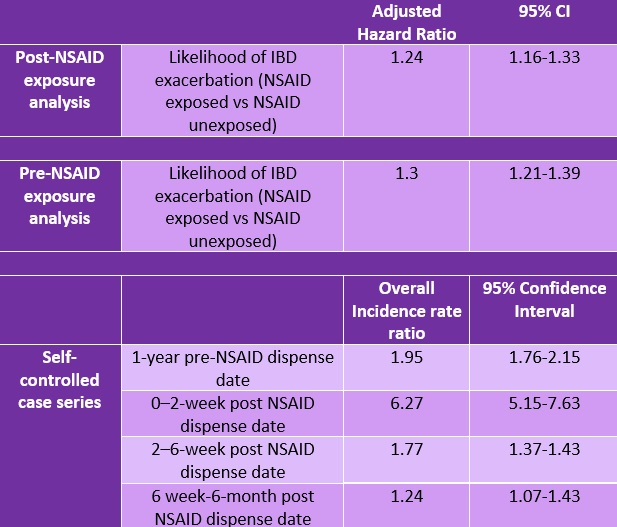 While the authors show an increased risk of IBD exacerbations following NSAID exposure, they also observed that the overall likelihood of IBD exacerbation before NSAID exposure was also greater in the NSAID-exposed cohort (Table 1).