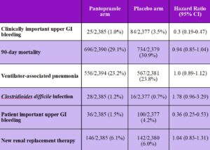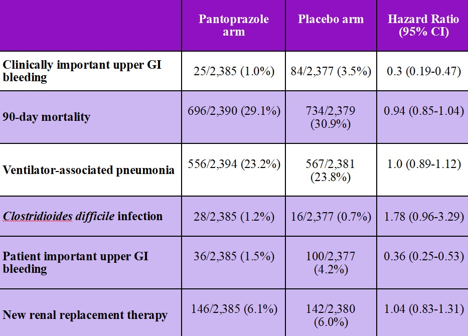 Outcomes: The primary efficacy outcome was clinically important upper GI bleeding defined as overt GI bleeding with evidence of hemodynamic compromise or leading to endoscopic/angiographic/surgical intervention in the ICU, occurring up to 90 days after randomization. The primary safety outcome was all-cause mortality at 90 days. Secondary outcomes included ventilator-associated pneumonia, treatment with renal-replacement therapy, ICU and hospital mortality, patient-important upper GI bleeding (i.e. receipt of at least one blood transfusion, vasopressors, receipt of diagnostic endoscopy, CT angiography, or surgery, outcomes of death, disability, or prolonged hospitalization). Tertiary outcomes included total number of red blood cell transfusions, peak serum creatinine level, duration of mechanical ventilation, hospital and ICU length of stay.