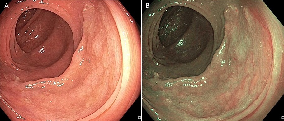 Figure 1. Large sessile serrated lesion without features of dysplasia or submucosal invasion under high-definition white light (A) and narrow band imaging (B).