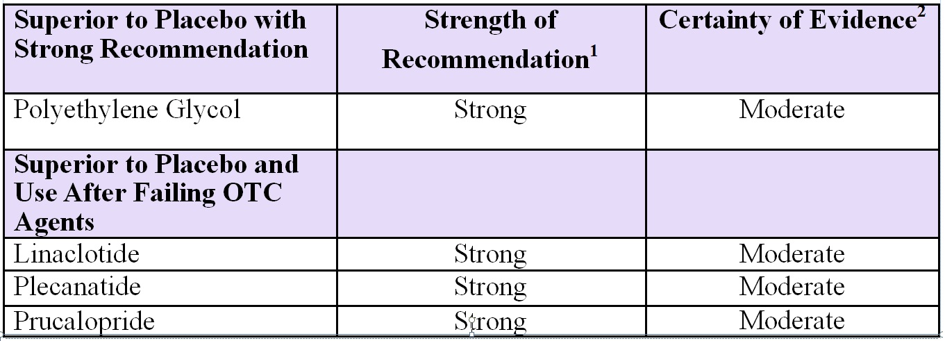 Results: Among over the counter (OTC) agents, PEG was the only therapy to receive a strong recommendation for chronic use (Table 1). Bisacodyl/sodium picosulfate received a strong recommendation for short-term (< 4 weeks) use or as rescue therapy. Based on low or very low-quality evidence, other OTC agents, including fiber supplements—specifically psyllium—senna, magnesium oxide, and lactulose were suggested for use (i.e, conditional recommendation: different choices will be appropriate for individual patients consistent with his/her values and preferences.) Among prescription agents, linaclotide, plecanatide, and prucalopride were all strongly recommended for use after unsuccessful trials of OTC agents, based on moderate certainty of evidence about treatment effect and risk of adverse events. Lubiprostone was suggested based on low certainty of evidence. No assessment of surfactant laxatives/stool softeners was provided.