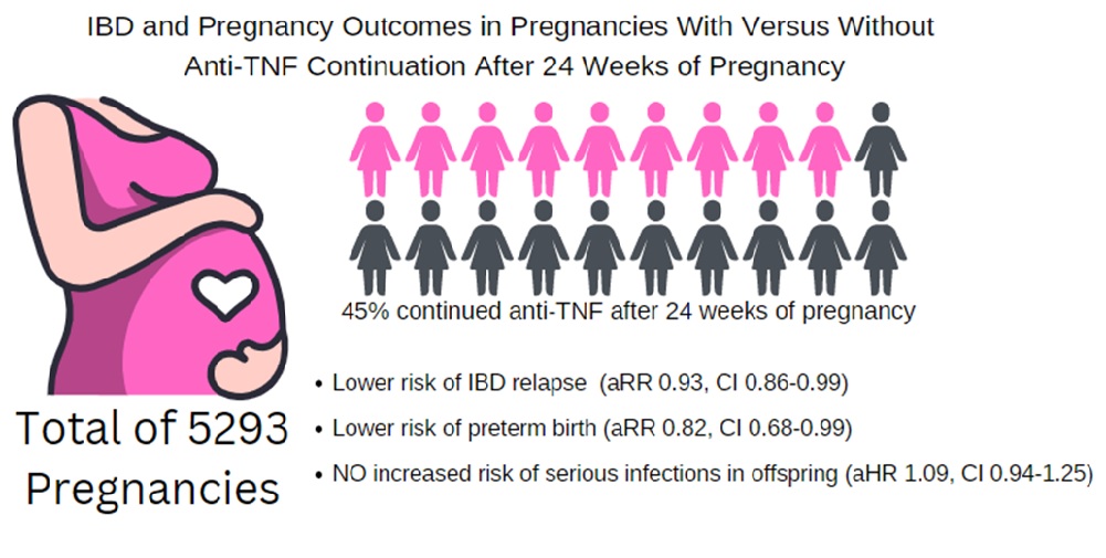 Results: Approximately 55% of pregnant women treated for IBD discontinued anti-TNF treatment before 24 weeks of pregnancy. Prescription of anti-TNF during pregnancy beyond 24 weeks of gestation was associated with less IBD relapse (adjusted rate ratio [aRR] 0.93, 95% confidence interval [CI] 0.86–0.99), a lower rate of prematurity (aRR 0.82, CI 0.68-0.99), and no difference in the overall rate of serious infections in the offspring (adjusted hazard ratio [aHR] 1.08, CI 0.94-1.25) (Figure 1). Importantly, 88.3% of women who had continued anti-TNF after 24 weeks of pregnancy were still treated with anti-TNF after 6 months of delivery, whereas only 71.1% of those who had stopped anti-TNF therapy before 24 weeks had it restarted. This study followed infants for risk of serious infections up to 5 years of age showing no increase in overall risk of infections throughout the first 5 years of the infants’ life.