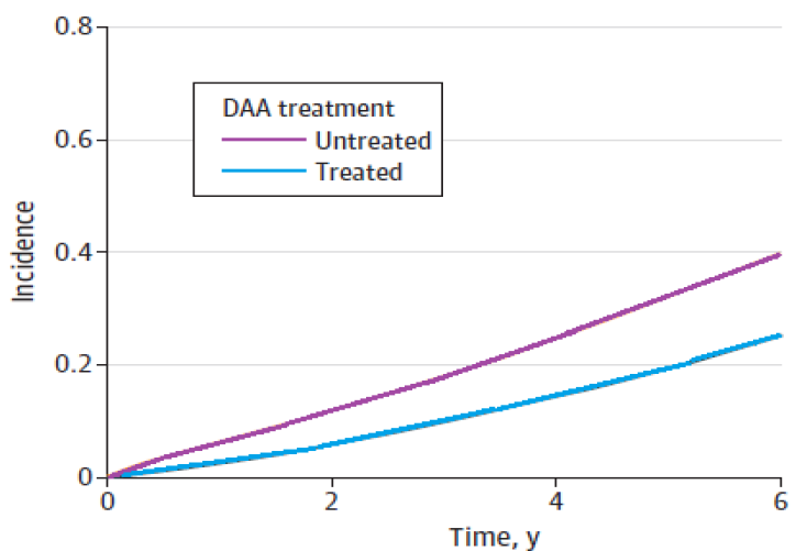 Achieving sustained virologic response was not a primary outcome of the study. However, given the efficacy of DAAs, most patients prescribed DAAs probably achieved sustained virologic response. Study patients had private insurance or Medicare Advantage and may differ from non-insured individuals. Consistent with large database studies, misclassification bias is possible despite using International Classification of Diseases, Ninth Revision, Clinical Modification (ICD-9-CM) and ICD-10-CM codes to identify outcomes.
