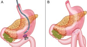 Figure 1. Methods of treatment for gastric outlet obstruction. Panel A shows the endoscopic ultrasound-guided gastroenterostomy approach, in which a lumen-apposing metal stent is placed into the jejunum from the gastric lumen. Panel B shows the surgical gastrojejunostomy approach.