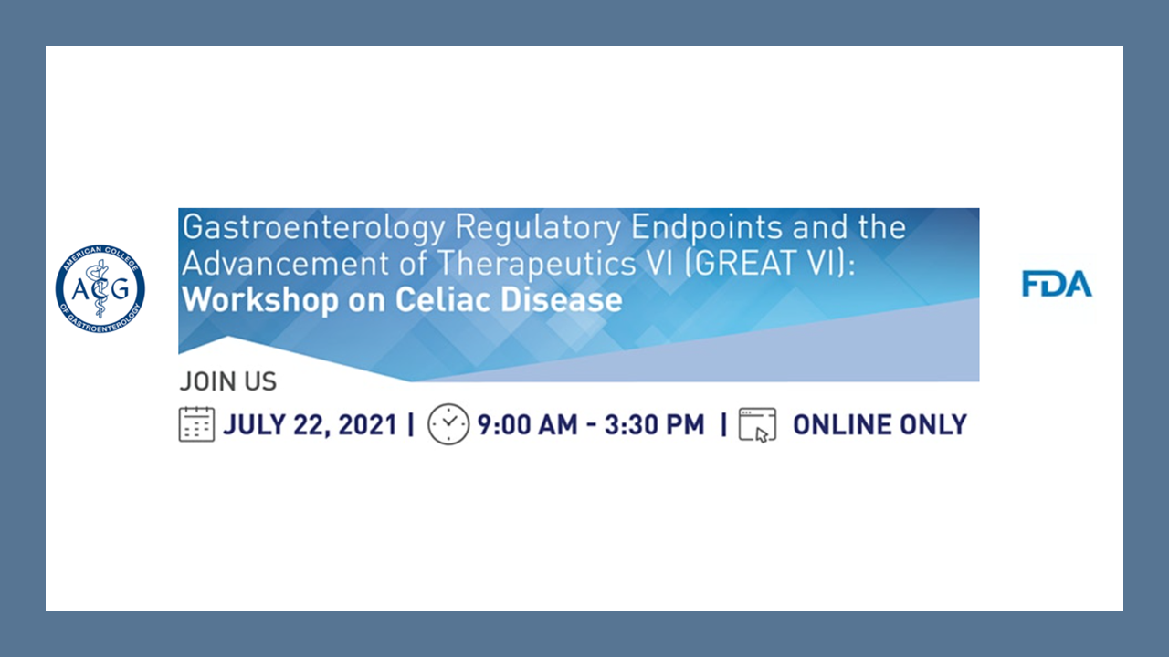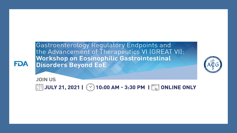 Register today for the upcoming "Gastroenterology Regulatory Endpoints and the Advancement of Therapeutics VI (GREAT VI)" Workshops. The U.S. Food and Drug Administration (FDA) is partnering with ACG and other medical societies on two important GI workshops on July 21 and July 22.